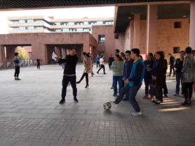 本次活动组织了:足球射门、长绳跳、职工排球比赛、师生排球赛、两人夹球接力等一个又一个的趣味项目,旁观助阵的师生也在一边为队员们加油,精彩的比赛项目不时的引起观众的阵阵笑声,现场充满了欢声笑语。