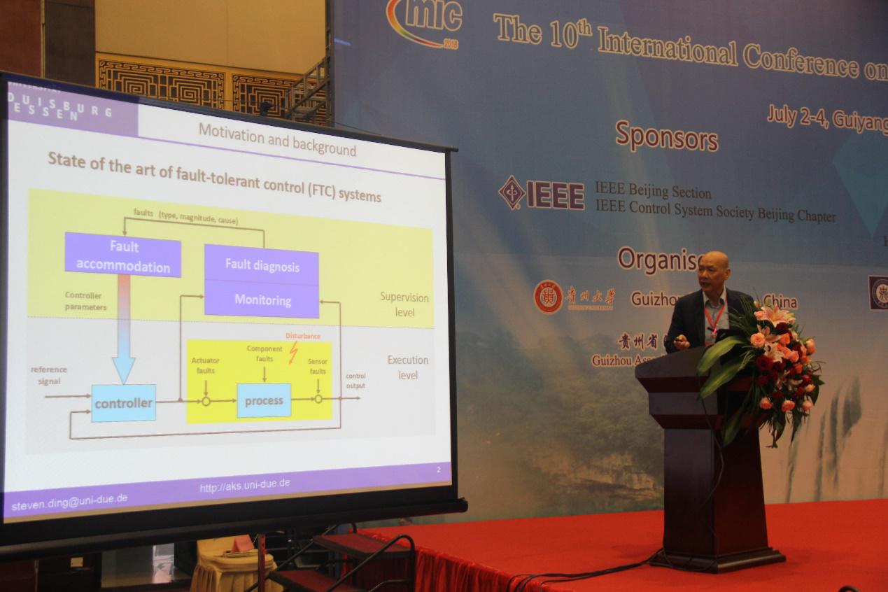 接着,德国杜伊斯堡-艾森大学Steven X. Ding教授作为本次会议第一位主讲上台,作了主题为《Control,Detection and Estimation》的学术报告,他认为控制、估计和检测可以在统一的模块中处理,统一模型是基础控制;在提高估测动作能增进控制动作的环境里控制实际上是个估计问题;容错控制(FTC)作为第一点提到的统一模块的一种方式不妨用机器学习技术解决。此外,Steven X. Ding教授还提到线性二次型(LQ)最优控制器能保证良好的控制性能 (稳定裕度等),而使用观察者会导致性能较差,但通过 LTR (循环传输恢复) 方案, 不尽人意的表现又将出现。