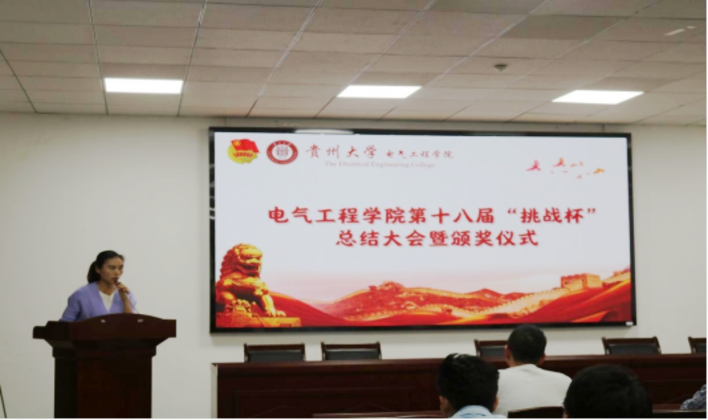 大会伊始,学院党委副书记赵晓丹致辞。赵书记首先强调挑战杯是近年来规格最高、规模最大的全国性的大学生竞赛活动,同时也是展现贵大形象的绝好时机,希望大家能够抓住机遇。她接着表示对参赛团队寄予期望,希望各参赛团队能进一步精心打磨作品,希望学生们能积极融入团队,发扬电工学子不怕苦、不怕累的优良传统,期待大家捷报频传!
